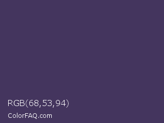RGB 68,53,94 Color is a dark violet color and the nearest color is Gun Powder #414257. Hex code #44355e and RGB value is rgb(68,53,94). In RGB color space, this color is composed of 27% red, 21% green, 37% blue, In CMYK color space, this color is composed of 28% cyan, 44% magenta, 0% yellow , 63% black , In HSL color space, this color has a hue angle of 262° , 28% saturation and 29% lightness.