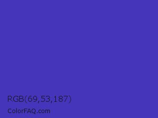 RGB 69,53,187 Color is a normal indigo color and the nearest color is Ocean Blue #4f42b5. Hex code #4535bb and RGB value is rgb(69,53,187). In RGB color space, this color is composed of 27% red, 21% green, 73% blue, In CMYK color space, this color is composed of 63% cyan, 72% magenta, 0% yellow , 27% black , In HSL color space, this color has a hue angle of 247° , 56% saturation and 47% lightness.