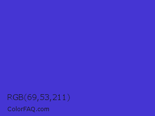 RGB 69,53,211 Color is a normal indigo color and the nearest color is Iris #5a4fcf. Hex code #4535d3 and RGB value is rgb(69,53,211). In RGB color space, this color is composed of 27% red, 21% green, 83% blue, In CMYK color space, this color is composed of 67% cyan, 75% magenta, 0% yellow , 17% black , In HSL color space, this color has a hue angle of 246° , 64% saturation and 52% lightness.