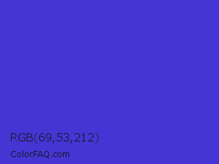 RGB 69,53,212 Color is a normal indigo color and the nearest color is Palatinate Blue #273be2. Hex code #4535d4 and RGB value is rgb(69,53,212). In RGB color space, this color is composed of 27% red, 21% green, 83% blue, In CMYK color space, this color is composed of 67% cyan, 75% magenta, 0% yellow , 17% black , In HSL color space, this color has a hue angle of 246° , 65% saturation and 52% lightness.