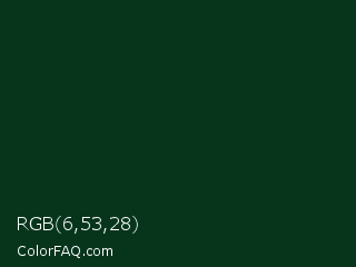 RGB 6,53,28 Color is a very dark green color and the nearest color is Cardin Green #01361c. Hex code #06351c and RGB value is rgb(6,53,28). In RGB color space, this color is composed of 2% red, 21% green, 11% blue, In CMYK color space, this color is composed of 89% cyan, 0% magenta, 47% yellow , 79% black , In HSL color space, this color has a hue angle of 148° , 80% saturation and 12% lightness.