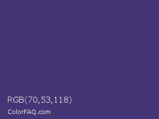 RGB 70,53,118 Color is a normal indigo color and the nearest color is Minsk #3f307f. Hex code #463576 and RGB value is rgb(70,53,118). In RGB color space, this color is composed of 27% red, 21% green, 46% blue, In CMYK color space, this color is composed of 41% cyan, 55% magenta, 0% yellow , 54% black , In HSL color space, this color has a hue angle of 256° , 38% saturation and 34% lightness.