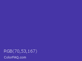 RGB 70,53,167 Color is a normal indigo color and the nearest color is Ocean Blue #4f42b5. Hex code #4635a7 and RGB value is rgb(70,53,167). In RGB color space, this color is composed of 27% red, 21% green, 65% blue, In CMYK color space, this color is composed of 58% cyan, 68% magenta, 0% yellow , 35% black , In HSL color space, this color has a hue angle of 249° , 52% saturation and 43% lightness.