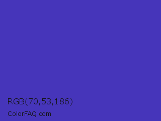 RGB 70,53,186 Color is a normal indigo color and the nearest color is Ocean Blue #4f42b5. Hex code #4635ba and RGB value is rgb(70,53,186). In RGB color space, this color is composed of 27% red, 21% green, 73% blue, In CMYK color space, this color is composed of 62% cyan, 72% magenta, 0% yellow , 27% black , In HSL color space, this color has a hue angle of 248° , 56% saturation and 47% lightness.