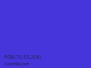 RGB 70,53,218 Color is a normal indigo color and the nearest color is Palatinate Blue #273be2. Hex code #4635da and RGB value is rgb(70,53,218). In RGB color space, this color is composed of 27% red, 21% green, 85% blue, In CMYK color space, this color is composed of 68% cyan, 76% magenta, 0% yellow , 15% black , In HSL color space, this color has a hue angle of 246° , 69% saturation and 53% lightness.