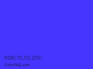 RGB 70,53,255 Color is a normal indigo color and the nearest color is Han Purple #5218fa. Hex code #4635ff and RGB value is rgb(70,53,255). In RGB color space, this color is composed of 27% red, 21% green, 100% blue, In CMYK color space, this color is composed of 73% cyan, 79% magenta, 0% yellow , 0% black , In HSL color space, this color has a hue angle of 245° , 100% saturation and 60% lightness.