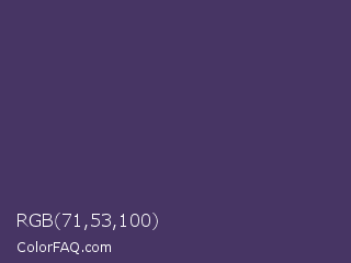 RGB 71,53,100 Color is a dark violet color and the nearest color is Bossanova #4e2a5a. Hex code #473564 and RGB value is rgb(71,53,100). In RGB color space, this color is composed of 28% red, 21% green, 39% blue, In CMYK color space, this color is composed of 29% cyan, 47% magenta, 0% yellow , 61% black , In HSL color space, this color has a hue angle of 263° , 31% saturation and 30% lightness.