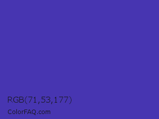 RGB 71,53,177 Color is a normal indigo color and the nearest color is Ocean Blue #4f42b5. Hex code #4735b1 and RGB value is rgb(71,53,177). In RGB color space, this color is composed of 28% red, 21% green, 69% blue, In CMYK color space, this color is composed of 60% cyan, 70% magenta, 0% yellow , 31% black , In HSL color space, this color has a hue angle of 249° , 54% saturation and 45% lightness.