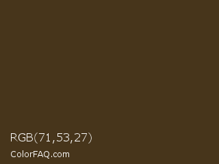 RGB 71,53,27 Color is a very dark orange color and the nearest color is Metallic Bronze #49371b. Hex code #47351b and RGB value is rgb(71,53,27). In RGB color space, this color is composed of 28% red, 21% green, 11% blue, In CMYK color space, this color is composed of 0% cyan, 25% magenta, 62% yellow , 72% black , In HSL color space, this color has a hue angle of 35° , 45% saturation and 19% lightness.