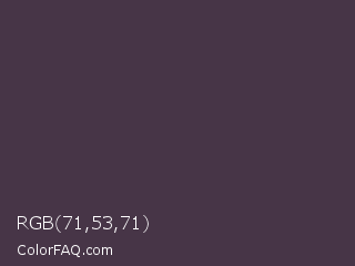 RGB 71,53,71 Color is a dark magenta color and the nearest color is Ship Gray #3e3a44. Hex code #473547 and RGB value is rgb(71,53,71). In RGB color space, this color is composed of 28% red, 21% green, 28% blue, In CMYK color space, this color is composed of 0% cyan, 25% magenta, 0% yellow , 72% black , In HSL color space, this color has a hue angle of 300° , 15% saturation and 24% lightness.