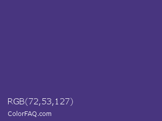 RGB 72,53,127 Color is a normal indigo color and the nearest color is Minsk #3f307f. Hex code #48357f and RGB value is rgb(72,53,127). In RGB color space, this color is composed of 28% red, 21% green, 50% blue, In CMYK color space, this color is composed of 43% cyan, 58% magenta, 0% yellow , 50% black , In HSL color space, this color has a hue angle of 255° , 41% saturation and 35% lightness.