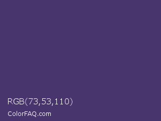 RGB 73,53,110 Color is a normal violet color and the nearest color is Jacarta #3a2a6a. Hex code #49356e and RGB value is rgb(73,53,110). In RGB color space, this color is composed of 29% red, 21% green, 43% blue, In CMYK color space, this color is composed of 34% cyan, 52% magenta, 0% yellow , 57% black , In HSL color space, this color has a hue angle of 261° , 35% saturation and 32% lightness.