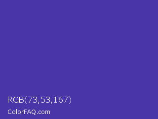 RGB 73,53,167 Color is a normal indigo color and the nearest color is Ocean Blue #4f42b5. Hex code #4935a7 and RGB value is rgb(73,53,167). In RGB color space, this color is composed of 29% red, 21% green, 65% blue, In CMYK color space, this color is composed of 56% cyan, 68% magenta, 0% yellow , 35% black , In HSL color space, this color has a hue angle of 251° , 52% saturation and 43% lightness.