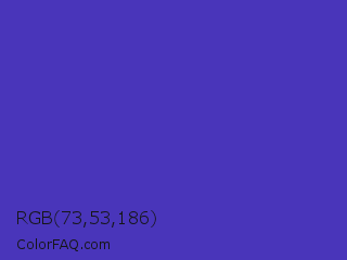 RGB 73,53,186 Color is a normal indigo color and the nearest color is Ocean Blue #4f42b5. Hex code #4935ba and RGB value is rgb(73,53,186). In RGB color space, this color is composed of 29% red, 21% green, 73% blue, In CMYK color space, this color is composed of 61% cyan, 72% magenta, 0% yellow , 27% black , In HSL color space, this color has a hue angle of 249° , 56% saturation and 47% lightness.