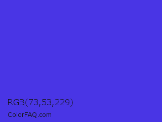 RGB 73,53,229 Color is a normal indigo color and the nearest color is Palatinate Blue #273be2. Hex code #4935e5 and RGB value is rgb(73,53,229). In RGB color space, this color is composed of 29% red, 21% green, 90% blue, In CMYK color space, this color is composed of 68% cyan, 77% magenta, 0% yellow , 10% black , In HSL color space, this color has a hue angle of 247° , 77% saturation and 55% lightness.