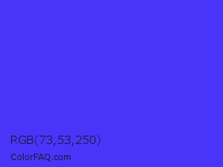 RGB 73,53,250 Color is a normal indigo color and the nearest color is Han Purple #5218fa. Hex code #4935fa and RGB value is rgb(73,53,250). In RGB color space, this color is composed of 29% red, 21% green, 98% blue, In CMYK color space, this color is composed of 71% cyan, 79% magenta, 0% yellow , 2% black , In HSL color space, this color has a hue angle of 246° , 95% saturation and 59% lightness.