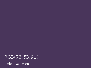 RGB 73,53,91 Color is a dark purple color and the nearest color is Voodoo #533455. Hex code #49355b and RGB value is rgb(73,53,91). In RGB color space, this color is composed of 29% red, 21% green, 36% blue, In CMYK color space, this color is composed of 20% cyan, 42% magenta, 0% yellow , 64% black , In HSL color space, this color has a hue angle of 272° , 26% saturation and 28% lightness.