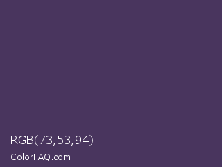 RGB 73,53,94 Color is a dark violet color and the nearest color is Bossanova #4e2a5a. Hex code #49355e and RGB value is rgb(73,53,94). In RGB color space, this color is composed of 29% red, 21% green, 37% blue, In CMYK color space, this color is composed of 22% cyan, 44% magenta, 0% yellow , 63% black , In HSL color space, this color has a hue angle of 269° , 28% saturation and 29% lightness.