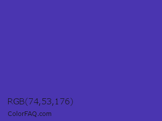 RGB 74,53,176 Color is a normal indigo color and the nearest color is Ocean Blue #4f42b5. Hex code #4a35b0 and RGB value is rgb(74,53,176). In RGB color space, this color is composed of 29% red, 21% green, 69% blue, In CMYK color space, this color is composed of 58% cyan, 70% magenta, 0% yellow , 31% black , In HSL color space, this color has a hue angle of 250° , 54% saturation and 45% lightness.