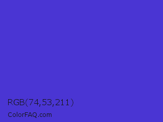 RGB 74,53,211 Color is a normal indigo color and the nearest color is Iris #5a4fcf. Hex code #4a35d3 and RGB value is rgb(74,53,211). In RGB color space, this color is composed of 29% red, 21% green, 83% blue, In CMYK color space, this color is composed of 65% cyan, 75% magenta, 0% yellow , 17% black , In HSL color space, this color has a hue angle of 248° , 64% saturation and 52% lightness.