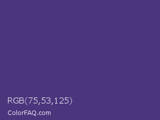 RGB 75,53,125 Color is a normal indigo color and the nearest color is Regalia #522d80. Hex code #4b357d and RGB value is rgb(75,53,125). In RGB color space, this color is composed of 29% red, 21% green, 49% blue, In CMYK color space, this color is composed of 40% cyan, 58% magenta, 0% yellow , 51% black , In HSL color space, this color has a hue angle of 258° , 40% saturation and 35% lightness.