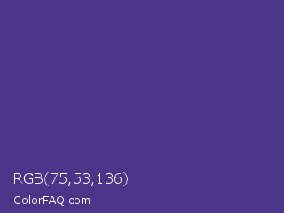 RGB 75,53,136 Color is a normal indigo color and the nearest color is Dark Slate Blue #483d8b. Hex code #4b3588 and RGB value is rgb(75,53,136). In RGB color space, this color is composed of 29% red, 21% green, 53% blue, In CMYK color space, this color is composed of 45% cyan, 61% magenta, 0% yellow , 47% black , In HSL color space, this color has a hue angle of 256° , 44% saturation and 37% lightness.