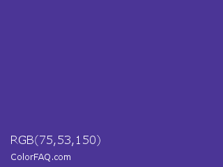 RGB 75,53,150 Color is a normal indigo color and the nearest color is Gigas #523c94. Hex code #4b3596 and RGB value is rgb(75,53,150). In RGB color space, this color is composed of 29% red, 21% green, 59% blue, In CMYK color space, this color is composed of 50% cyan, 65% magenta, 0% yellow , 41% black , In HSL color space, this color has a hue angle of 254° , 48% saturation and 40% lightness.