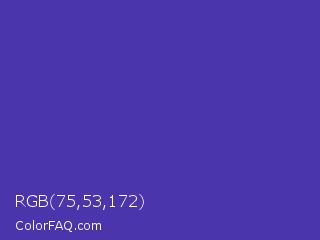 RGB 75,53,172 Color is a normal indigo color and the nearest color is Ocean Blue #4f42b5. Hex code #4b35ac and RGB value is rgb(75,53,172). In RGB color space, this color is composed of 29% red, 21% green, 67% blue, In CMYK color space, this color is composed of 56% cyan, 69% magenta, 0% yellow , 33% black , In HSL color space, this color has a hue angle of 251° , 53% saturation and 44% lightness.