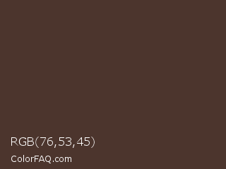RGB 76,53,45 Color is a dark color and the nearest color is Rock #4d3833. Hex code #4c352d and RGB value is rgb(76,53,45). In RGB color space, this color is composed of 30% red, 21% green, 18% blue, In CMYK color space, this color is composed of 0% cyan, 30% magenta, 41% yellow , 70% black , In HSL color space, this color has a hue angle of 15° , 26% saturation and 24% lightness.