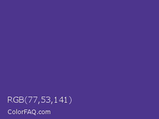 RGB 77,53,141 Color is a normal indigo color and the nearest color is Blue Magenta Violet #553592. Hex code #4d358d and RGB value is rgb(77,53,141). In RGB color space, this color is composed of 30% red, 21% green, 55% blue, In CMYK color space, this color is composed of 45% cyan, 62% magenta, 0% yellow , 45% black , In HSL color space, this color has a hue angle of 256° , 45% saturation and 38% lightness.