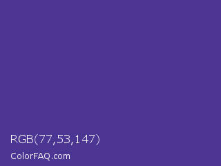 RGB 77,53,147 Color is a normal indigo color and the nearest color is Blue Magenta Violet #553592. Hex code #4d3593 and RGB value is rgb(77,53,147). In RGB color space, this color is composed of 30% red, 21% green, 58% blue, In CMYK color space, this color is composed of 48% cyan, 64% magenta, 0% yellow , 42% black , In HSL color space, this color has a hue angle of 255° , 47% saturation and 39% lightness.