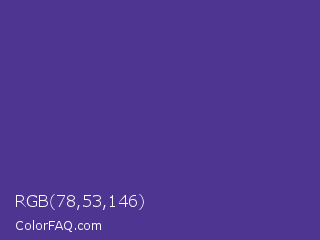 RGB 78,53,146 Color is a normal indigo color and the nearest color is Blue Magenta Violet #553592. Hex code #4e3592 and RGB value is rgb(78,53,146). In RGB color space, this color is composed of 31% red, 21% green, 57% blue, In CMYK color space, this color is composed of 47% cyan, 64% magenta, 0% yellow , 43% black , In HSL color space, this color has a hue angle of 256° , 47% saturation and 39% lightness.