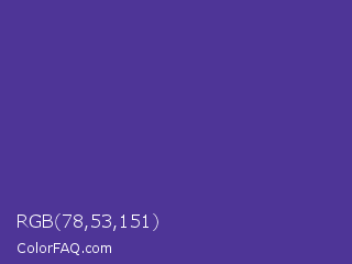 RGB 78,53,151 Color is a normal indigo color and the nearest color is Gigas #523c94. Hex code #4e3597 and RGB value is rgb(78,53,151). In RGB color space, this color is composed of 31% red, 21% green, 59% blue, In CMYK color space, this color is composed of 48% cyan, 65% magenta, 0% yellow , 41% black , In HSL color space, this color has a hue angle of 255° , 48% saturation and 40% lightness.