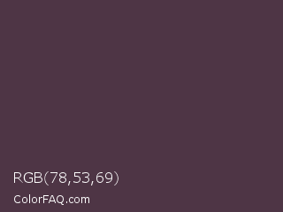 RGB 78,53,69 Color is a dark magenta color and the nearest color is Matterhorn #4e3b41. Hex code #4e3545 and RGB value is rgb(78,53,69). In RGB color space, this color is composed of 31% red, 21% green, 27% blue, In CMYK color space, this color is composed of 0% cyan, 32% magenta, 12% yellow , 69% black , In HSL color space, this color has a hue angle of 322° , 19% saturation and 26% lightness.