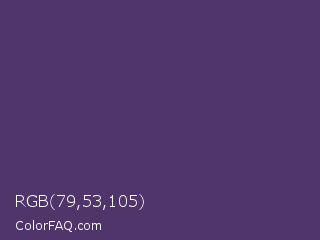 RGB 79,53,105 Color is a normal violet color and the nearest color is English Violet #563c5c. Hex code #4f3569 and RGB value is rgb(79,53,105). In RGB color space, this color is composed of 31% red, 21% green, 41% blue, In CMYK color space, this color is composed of 25% cyan, 50% magenta, 0% yellow , 59% black , In HSL color space, this color has a hue angle of 270° , 33% saturation and 31% lightness.