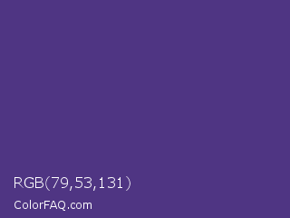 RGB 79,53,131 Color is a normal indigo color and the nearest color is Regalia #522d80. Hex code #4f3583 and RGB value is rgb(79,53,131). In RGB color space, this color is composed of 31% red, 21% green, 51% blue, In CMYK color space, this color is composed of 40% cyan, 60% magenta, 0% yellow , 49% black , In HSL color space, this color has a hue angle of 260° , 42% saturation and 36% lightness.