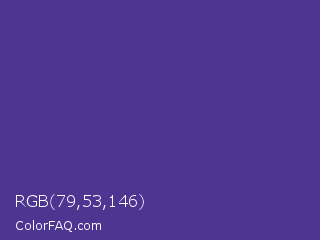 RGB 79,53,146 Color is a normal indigo color and the nearest color is Blue Magenta Violet #553592. Hex code #4f3592 and RGB value is rgb(79,53,146). In RGB color space, this color is composed of 31% red, 21% green, 57% blue, In CMYK color space, this color is composed of 46% cyan, 64% magenta, 0% yellow , 43% black , In HSL color space, this color has a hue angle of 257° , 47% saturation and 39% lightness.