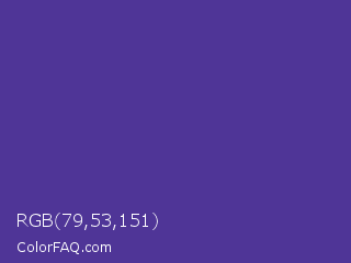 RGB 79,53,151 Color is a normal indigo color and the nearest color is Blue Magenta Violet #553592. Hex code #4f3597 and RGB value is rgb(79,53,151). In RGB color space, this color is composed of 31% red, 21% green, 59% blue, In CMYK color space, this color is composed of 48% cyan, 65% magenta, 0% yellow , 41% black , In HSL color space, this color has a hue angle of 256° , 48% saturation and 40% lightness.