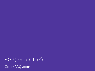 RGB 79,53,157 Color is a normal indigo color and the nearest color is Gigas #523c94. Hex code #4f359d and RGB value is rgb(79,53,157). In RGB color space, this color is composed of 31% red, 21% green, 62% blue, In CMYK color space, this color is composed of 50% cyan, 66% magenta, 0% yellow , 38% black , In HSL color space, this color has a hue angle of 255° , 50% saturation and 41% lightness.