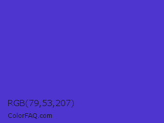 RGB 79,53,207 Color is a normal indigo color and the nearest color is Purple Heart Crayola #652dc1. Hex code #4f35cf and RGB value is rgb(79,53,207). In RGB color space, this color is composed of 31% red, 21% green, 81% blue, In CMYK color space, this color is composed of 62% cyan, 74% magenta, 0% yellow , 19% black , In HSL color space, this color has a hue angle of 250° , 62% saturation and 51% lightness.