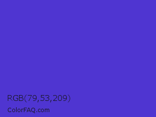 RGB 79,53,209 Color is a normal indigo color and the nearest color is Iris #5a4fcf. Hex code #4f35d1 and RGB value is rgb(79,53,209). In RGB color space, this color is composed of 31% red, 21% green, 82% blue, In CMYK color space, this color is composed of 62% cyan, 75% magenta, 0% yellow , 18% black , In HSL color space, this color has a hue angle of 250° , 63% saturation and 51% lightness.