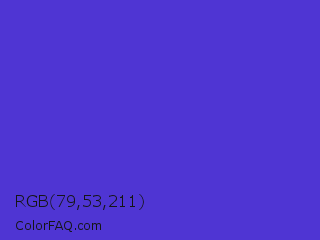 RGB 79,53,211 Color is a normal indigo color and the nearest color is Iris #5a4fcf. Hex code #4f35d3 and RGB value is rgb(79,53,211). In RGB color space, this color is composed of 31% red, 21% green, 83% blue, In CMYK color space, this color is composed of 63% cyan, 75% magenta, 0% yellow , 17% black , In HSL color space, this color has a hue angle of 250° , 64% saturation and 52% lightness.