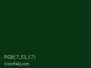 RGB 7,53,17 Color is a very dark green color and the nearest color is English Holly #022d15. Hex code #073511 and RGB value is rgb(7,53,17). In RGB color space, this color is composed of 3% red, 21% green, 7% blue, In CMYK color space, this color is composed of 87% cyan, 0% magenta, 68% yellow , 79% black , In HSL color space, this color has a hue angle of 133° , 77% saturation and 12% lightness.