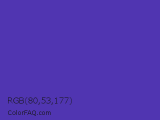 RGB 80,53,177 Color is a normal indigo color and the nearest color is Ocean Blue #4f42b5. Hex code #5035b1 and RGB value is rgb(80,53,177). In RGB color space, this color is composed of 31% red, 21% green, 69% blue, In CMYK color space, this color is composed of 55% cyan, 70% magenta, 0% yellow , 31% black , In HSL color space, this color has a hue angle of 253° , 54% saturation and 45% lightness.