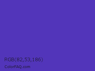 RGB 82,53,186 Color is a normal indigo color and the nearest color is Ocean Blue #4f42b5. Hex code #5235ba and RGB value is rgb(82,53,186). In RGB color space, this color is composed of 32% red, 21% green, 73% blue, In CMYK color space, this color is composed of 56% cyan, 72% magenta, 0% yellow , 27% black , In HSL color space, this color has a hue angle of 253° , 56% saturation and 47% lightness.