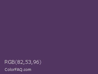 RGB 82,53,96 Color is a dark purple color and the nearest color is English Violet #563c5c. Hex code #523560 and RGB value is rgb(82,53,96). In RGB color space, this color is composed of 32% red, 21% green, 38% blue, In CMYK color space, this color is composed of 15% cyan, 45% magenta, 0% yellow , 62% black , In HSL color space, this color has a hue angle of 280° , 29% saturation and 29% lightness.