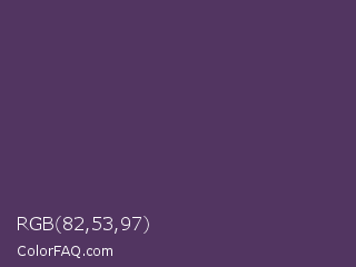 RGB 82,53,97 Color is a dark purple color and the nearest color is English Violet #563c5c. Hex code #523561 and RGB value is rgb(82,53,97). In RGB color space, this color is composed of 32% red, 21% green, 38% blue, In CMYK color space, this color is composed of 15% cyan, 45% magenta, 0% yellow , 62% black , In HSL color space, this color has a hue angle of 280° , 29% saturation and 29% lightness.