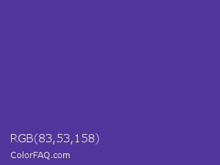 RGB 83,53,158 Color is a normal indigo color and the nearest color is Blue Magenta Violet #553592. Hex code #53359e and RGB value is rgb(83,53,158). In RGB color space, this color is composed of 33% red, 21% green, 62% blue, In CMYK color space, this color is composed of 47% cyan, 66% magenta, 0% yellow , 38% black , In HSL color space, this color has a hue angle of 257° , 50% saturation and 41% lightness.