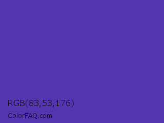 RGB 83,53,176 Color is a normal indigo color and the nearest color is Ocean Blue #4f42b5. Hex code #5335b0 and RGB value is rgb(83,53,176). In RGB color space, this color is composed of 33% red, 21% green, 69% blue, In CMYK color space, this color is composed of 53% cyan, 70% magenta, 0% yellow , 31% black , In HSL color space, this color has a hue angle of 255° , 54% saturation and 45% lightness.