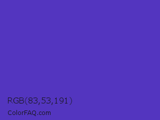 RGB 83,53,191 Color is a normal indigo color and the nearest color is Ocean Blue #4f42b5. Hex code #5335bf and RGB value is rgb(83,53,191). In RGB color space, this color is composed of 33% red, 21% green, 75% blue, In CMYK color space, this color is composed of 57% cyan, 72% magenta, 0% yellow , 25% black , In HSL color space, this color has a hue angle of 253° , 57% saturation and 48% lightness.